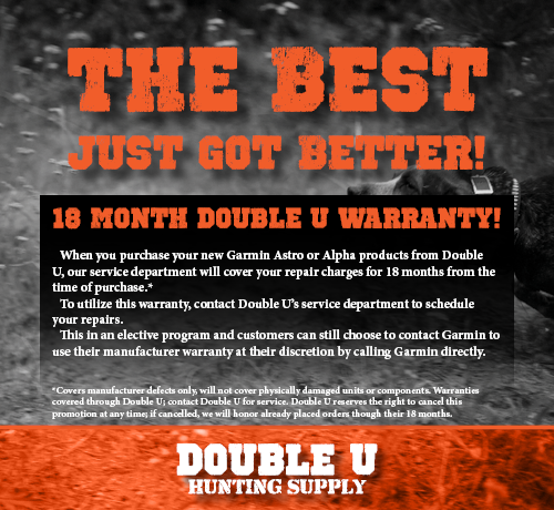 For 18 months from the date of purchase, Double U will warranty all new Garmin Astro and Alpha products to be free of manufacturer's defects. This warranty works in parallel to Garmin's 1 year Limited Warranty and will be honored for the full 12 months offered by Garmin and an additional 6 offered by Double U. To utilize this service, warranty repair must be completed through Double U Hunting Supply. This is an elective program and customers are free to contact Garmin for their warranty issues if they choose.
