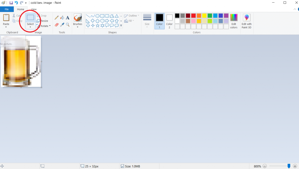 Your image is going to be quite small so we recommend dragging the zoom bar at the bottom right hand corner up to 800% to view the image more clearly. After that, click on rectangle above the select tool to allow you to select your image. Then, click and drag to capture the entire image - right click the image and select copy.