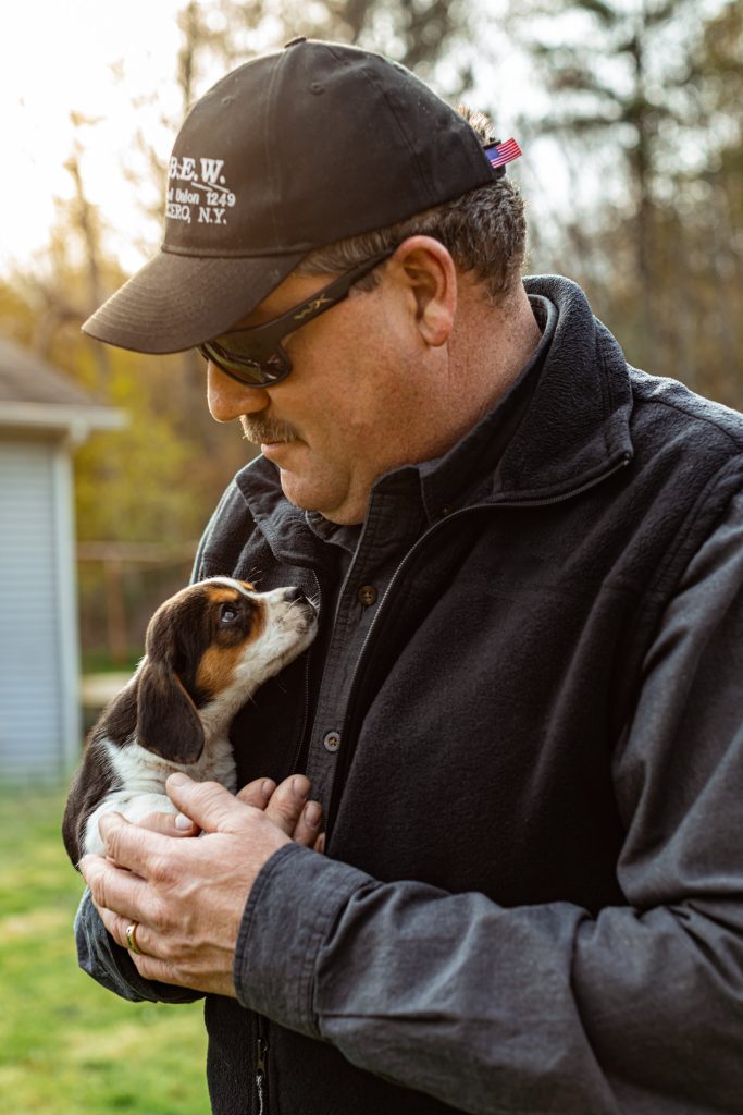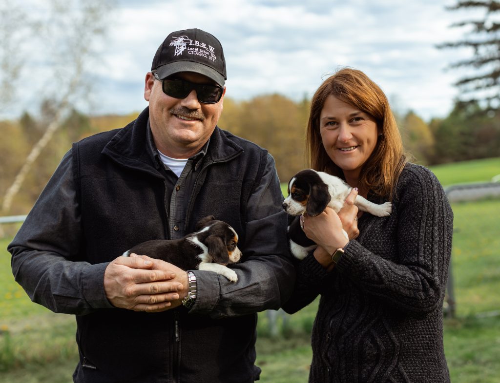 “This is my third dog from Brandon,” said Robert Cunningham of Massena, New York. “His dogs have speed and a strong intelligence. They are great in our home, but when they get their nose to the ground, they just run! Lightning speed! These dogs are total machines.” His wife Melanie also appreciates their off-switch. “They have a great temperament. They’re well-loved and totally spoiled—they sleep in our bed.”